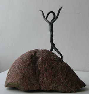 Hahmo kiipeää pitkin rantakallio jumpaten samalla. Korkeus n.20cm .valmistunut -02 . Myyty.
